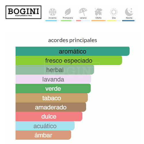 - Notas destacadas: Lavanda, notas acuáticas, mopán, tabaco, ciprés, sándalo